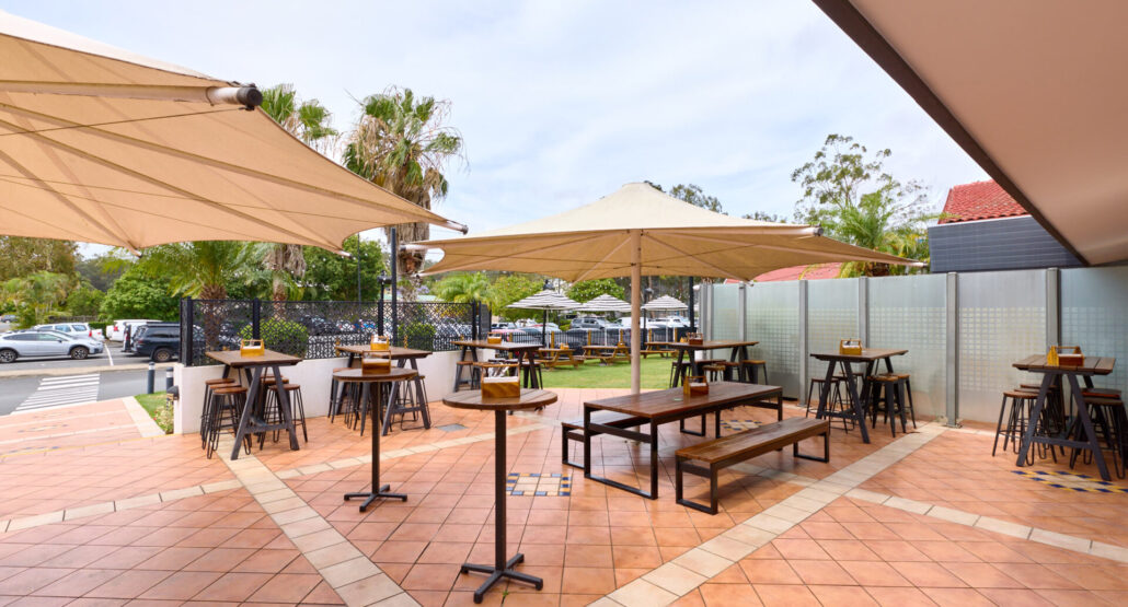 Step into our vibrant outdoor space just outside the sports bar, designed for casual gatherings and relaxed events. With ample shade from large, stylish umbrellas and a mix of high-top tables and benches, this area offers the perfect atmosphere for enjoying drinks with friends, catching the game, or hosting informal functions. Whether you’re celebrating a small victory or unwinding after work, this space provides a comfortable, lively setting just steps away from the excitement of the sports bar.